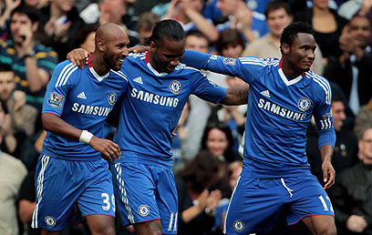 מיקל, דרוגבה ואנלקה חוגגים את השישיה של צ'לסי (גטי אימג'ס)