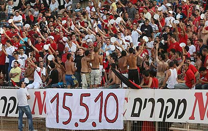 אוהדי הפועל חיפה והשלט אתמול בקריית אליעזר (צילום: חגי אהרון)