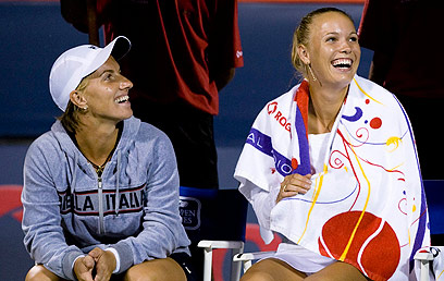 ווזניאקי וקוזנצובה ממתינות בהפסקת הגשם במונטריאול (צילום: AP)