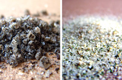 בעין: גבישים בגודל 1-4 מ"מ שלאחר המעבר במטחנה הפכו למלח דק.