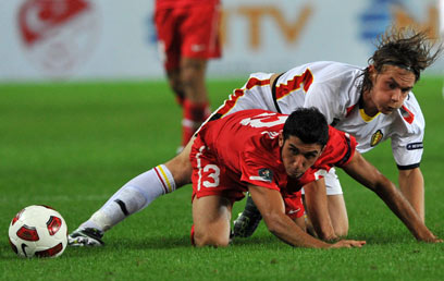 איסמעיל קויבאסי מטורקיה (באדום) וגיום ג'ילה מבלגיה (AFP)