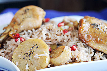 - אם רוצים אפשר להשאיר את העוף בתנור עד לתחילתה של הארוחה המפסקת. מגישים עם תבשיל האורז ותפוחי האדמה וסלט הירקות והרימונים.