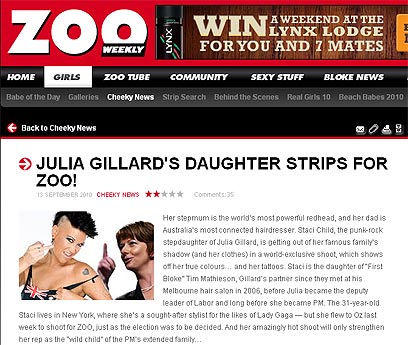 ג'וליה גילארד, נשבעה הבוקר (יום ג') מחדש לתפקיד ראש ממשלת אוסטרליה. אך דווקא ביום המשמח, בחרה בתה החורגת סטייסי צ'ילד, לגנוב ממנה את תשומת הלב. תמונותיה של צ'ילד בת ה-31 בביקיני ובתנוחות שאינן משאירות מקום לדמיון, נמרחו הבוקר על שער הצהובון האוסטרלי "זו וויקלי".