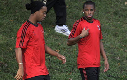 רונאלדיניו ורוביניו מתכננים את המשחק מול אוקזר (AFP)