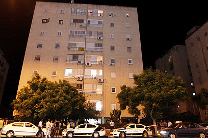 ניידות משטרה בפתח הבניין שבו אירע הרצח, הלילה (צילום: עידו ארז)