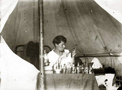 2. האחות במקום הייתה טניה סוקולובסקי-אפרתי. אחות באותן שנים היתה "חצי רופא" ואף עסקה במחקר לצורך הרחבת הידע הרפואי. בתצלום: טניה באוהל המרפאה. כאן הכינה את תרופת הכינין כנגד המלריה ושימרה סוגי נחשים בפורמלין, בכדי להעבירם למחקר בהדסה ירושלים.