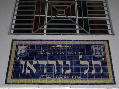 אריחי הקרמיקה בכניסה לבית הספר "תל נורדאו". כאן למדה תמר היפה