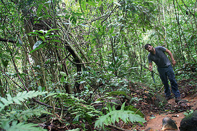 חיפשתי את הקטעים הפחות תלולים של המצוק, שנראו בטוחים יחסית. גלשתי בכל פעם במורד קירות בגובה כמה מטרים כשאני נאחז בצמחייה, מחליף נקודות אחיזה תוך כדי, ולפעמים גם משלים את המטר־שניים האחרונים בקפיצה קטנה, נפילה, או סתם התדרדרות בסגנון חופשי. שלושה ימים של שיטוט בתוספת לחות גבוהה, היעדר מקלחת, וגוף שהאנרגיה האחרונה שהוא צרך היתה קוביית שוקולד לפני יומיים עשו את שלהם: הייתי עייף, כמעט מותש, אבל מעודד מהעובדה שאני יודע את הכיוון, יודע לאן אני הולך. רבע שעה אחרי שעזבתי את קרחת היער והתחלתי לרדת - בדיוק כמו שדמיינתי בלילה הראשון - שמעתי מסוק מרחף מעלי.