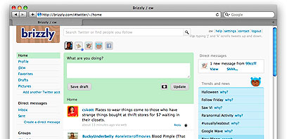 בחיבור לטוויטר יש דווקא כמה תוספות, כמו "תרגום" של קישור אל סרטון ביו-טיוב - במקום להראות רק את הקישור, מצמידים כבר את הסרטון עצמו אל העדכון בתוך .Brizzly הממשק עובד באנגלית, אבל אין בעיה לקרוא ולכתוב גם בעברית.