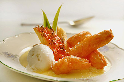 - הגשה: מניחים בצלחת עמוקה כ-5-6 צ'ורוס חמים ומעליהם כדור גדול של גלידת קוקוס טרייה. יוצקים בנדיבות מרוטב האננס ומקשטים בשבבי הקוקוס הקלוי. מגישים מייד.