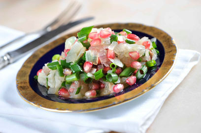 - קוצצים את הבצל הירוק ומפוררים את הרימונים.