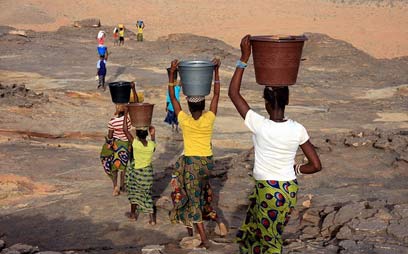 בנות הכפר נושאות דליים מלאים מים על ראשיהן