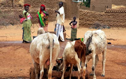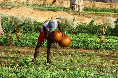 השקיית הערוגות ידנית, וכל בני הכפר נוטלים בה חלק. את המים שואבים באמצעות דלעות כדוריות גדולות שרוקנו מתוכנן. במסלולים שבין מפלס מי התהום הנמוך לערוגות הגבוהות מתנהלת תנועה בלתי פוסקת של ילדים, נשים וגברים העושים דרכם הלוך ושוב. בכפרים שעל הרמה אין מקורות מים המאפשרים חקלאות, ועל כן מתפרנסים המקומיים בעיקר מגידול עזים. גם שם עסוקות הנשים בהבאת מים לכפר ממקור מים המרוחק ממנו קילומטרים אחדים.