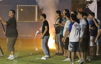 חם, לוהט. אוהדי מכבי פ"ת מוכנים לדרבי (צילום: אורן אהרוני)