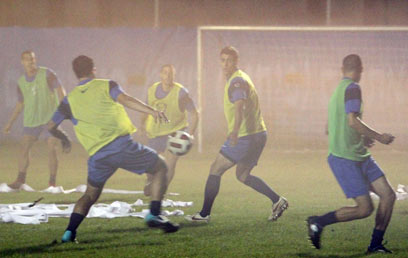 ערפל קרב. שחקני מכבי פ"ת באימון לקראת הדרבי (צילום: אורן אהרוני)