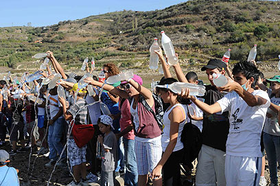 שופכים מים ממעיינות סמוכים לבריכה (צילום: אביהו שפירא)