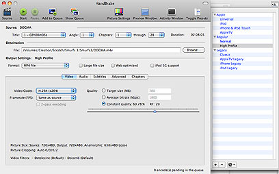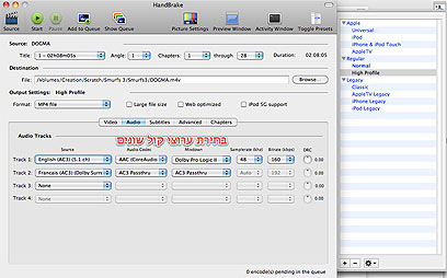 קל מאוד לבצע המרה, בזכות מספר תוכנות חינמיות שמסתובבות ברשת. אחת מהן, Handbreak, נוחה במיוחד ומתאימה גם למק ולינוקס. התוכנה מזהה את הסרטונים שעל הדיסק ומפרידה אותם לקבצים שונים, מאפשרת לבחור צורות המרה שונות לכל קובץ ויש לה גם מספר תבניות המרה קבועות מראש – גם לפורמט שמתאים ל-PSP או לאייפון. יהיה עליכם להוריד גם את VLC, תוכנת צפייה בווידאו, שכן הנדברייק משתמשת בקודקים שבאים עם התוכנה כדי לבצע חלק מההמרות.