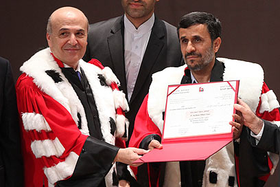 כמו מלך. אחמדיג'אד מקבל תואר כבוד באונ' ביירות (צילום: רויטרס)