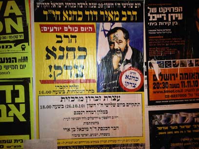 בלוחות מודעות עירוניים בבירה ובמקומות נוספים בארץ נתלו מאות כרזות המציינות 20 שנה לרצח הרב כהנא. בשמאל מוחים: "עיריית ירושלים עובדת בשביל ממשיכיו ומפיצה כרזות גזעניות"