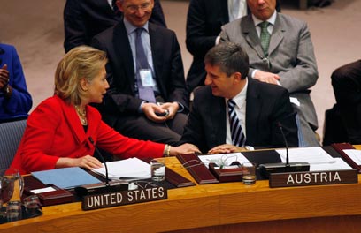 הילרי קלינטון הגיעה אתמול לדיון מיוחד במועצת הביטחון בנושא היעדר שילובן של נשים בשיחות שלום במוקדי סכסוך ברחבי העולם. לצדה במועצת הביטחון ישב שר החוץ האוסטרי, מיכאל שפינדלגר, ששוחח עימה לפני ואחרי הדיון.