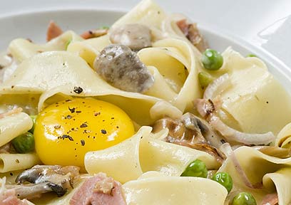 חזה אווז מעושן פוגש הרבה שמנת, יין לבן, קצת ירקות מעודנים וחלמון ביצה - והופך למנת פסטה מעודנת ועשירה