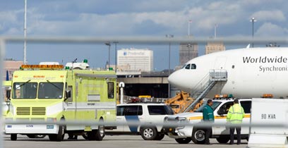 בוחנים את החפץ החשוד בטיסה שנחתה מצפון ללונדון (צילום: רויטרס)