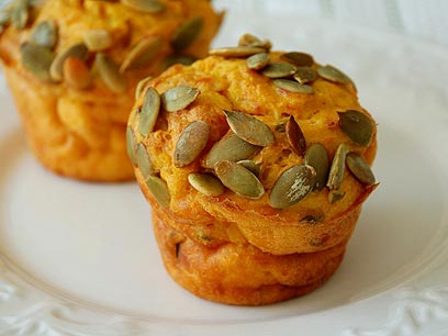 - מעטרים בנדיבות בזרעי דלעת ומכניסים לתנור. אופים במשך 35-40 דקות או עד שקיסם הננעץ במאפינס יוצא ויבש ושצדם העליון של המאפינס זהוב מאוד/משחים קלות. מוציאים, מצננים כ-10 דקות ומחלצים מהתבנית. מגישים מייד.