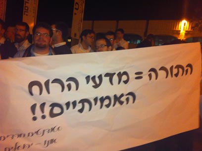 הסטודנטים החרדים נושאים שלטים שעליהם נכתב בין היתר "התורה = מדעי הרוח האמיתיים" ו"לא נתקצב בתשלום מסים את התרבות הקלוקלת".