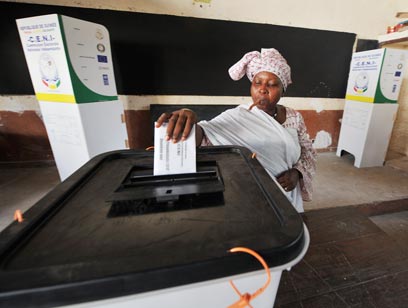 אשה מצביעה בקלפי בקונקרי, בירת גינאה (צילום: AFP)