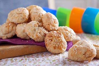 - מניחים נייר אפייה על תבנית שטוחה ומניחים עליו את עיגולי הבצק הממולאים. מברישים כל עיגול בביצה טרופה ומפזרים שומשום.