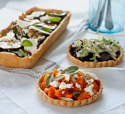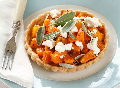 - מרכיבים את הטארט: מפוררים 3/4 מכמות הריקוטה על תחתית הטארט. מניחים את הדלעת הצלוייה, מפזרים עלי מרווה ומפוררים את שארית הריקוטה. מזליפים שמן זית ומתבלים במלח ופלפל.