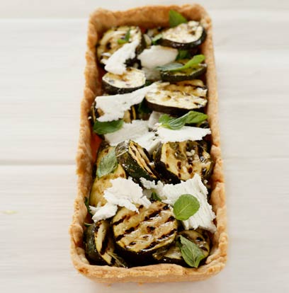 - מרכיבים את הטארט: בתחתית הטארט מניחים 3/4 מכמות הפטה. מעל הגבינה מניחים את הזוקיני עם מעט משמן הזית. מפזרים עלי נענע ומפוררים את הפטה. מתבלים במעט מלח ופלפל.