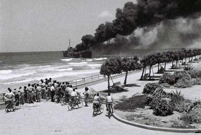 האלטלנה בוערת מול חוף ת"א (צילום: הנס פין, לע"מ)