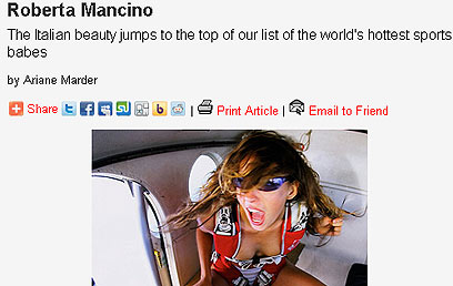 איטליה שוב אלופת העולם. מריה שראפובה? אנה קורניקובה אולי דווקא בלנקה ולאשיץ'? סקר גולשים של המגזין אף.אם האמריקני קבע כי הספורטאית היפה בעולם היא דווקא רוברטה מונצ'ינו האיטלקייה, מי שמתמחה בצניחה חופשית ונחשבת לאחת הטובות בעולם בתחומה.