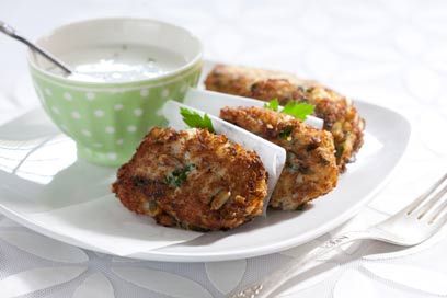 לביבות כרובית וגרעיני חמנייה ברוטב יוגורט, שום ושמיר