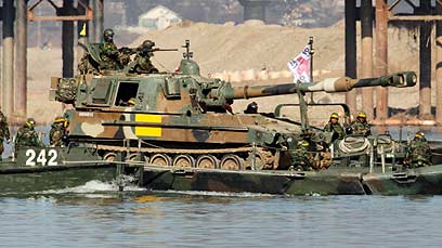 כוחות דרום קוריאנים סמוך לאי שהופצץ (צילום: AP)