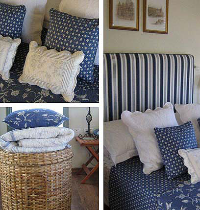 חדר השינה הפרטי בביתה של דה ליידה, מולבש במצעים, כריות וכיסויי מיטה עושיים 100% כותנה. מעל המיטה תלויות שתי תמונות עתיקות מהולנד, לצד סל כביסה ומנורה על השידה (צילומים: רוני דה ליידה)