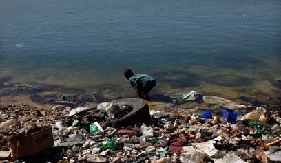 ילד מנסה לדוג סמוך לאחד ממחנות הפליטים (צילום: AFP)