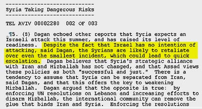 חודשיים בלבד לפני ההפצצה הישראלית בסוריה - שלפי מקורות זרים השמידה כור גרעיני - הצהיר בפני האמריקנים ראש המוסד, מאיר דגן, כי "לישראל אין שום כוונות לתקוף". דבריו של דגן נחשפו כחלק מההדלפה הגדולה בהיסטוריה, לאתר "ויקיליקס".