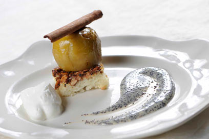 - הרכבת המנה: מניחים פרוסת עוגה מרובעת (בסיס), עליה תפוח מוברש בדבש ליד רוטב הפרג ומעט מוס יוגורט.