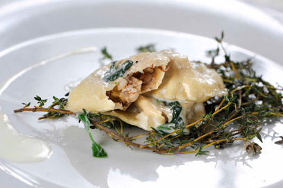 רביולי מבצק חלמונים במילוי כוסמת ברוטב שמנת ומנגולד