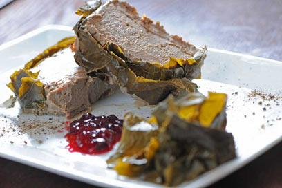 - בינתיים, מסדרים את עלי הגפן בתחתית תבנית אינגליש קייק. ממלאים אותה עד לשפתה בתערובת הכבד, מניחים עליה נייר אפייה ואוטמים היטב בעזרת נייר כסף. מניחים אותה על מגבת מקופלת, ומניחים אותה בזהירות, עם המגבת, ב"אמבט" המים החמים שבתנור (המגבת הרטובה מתחת לתבנית מיועדת למנוע תזוזה והחלקה של הפרפה).