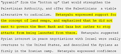 מתרץ את הדליפה. במסמך שנחשף בויקיליקס אמר ראש הממשלה לאמריקנים כי הוא תומך ברעיון של חילופי שטחים וכעת הוא מנסה להסביר למה התכוון. מלשכת ראש הממשלה נמסר בתגובה לפרסום המברק באתר ההדלפות כי כוונתו של בנימין נתניהו היתה שהוא יהיה מוכן לפשרות טריטוריאליות במסגרת הסכם שלום עתידי.