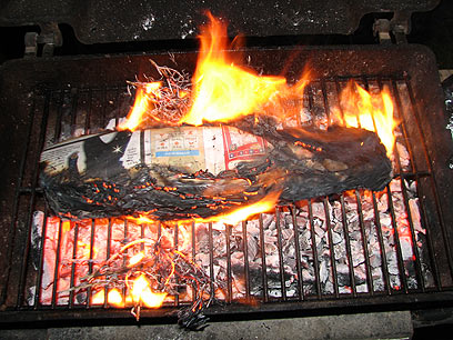 - מניחים על מנגל שחומם מראש ונותנים לנייר להישרף. על גחלים לוהטות ללא להבות הצלייה תארך כ-10 דקות מכל צד, אבל כדאי לבדוק מדי פעם אם בשר הדג כבר מוכן (צבעו משתנה ללבן). הופכים את הדג פעם אחת במהלך הצלייה.