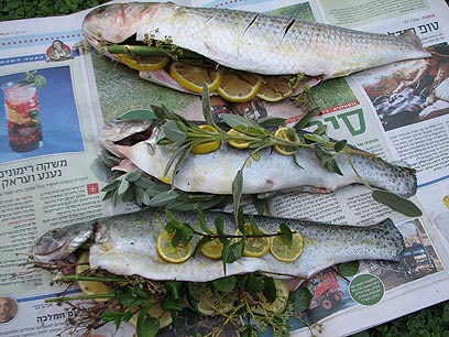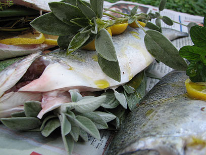 אני אוהב לעטוף דגי פורל או בורי בעיתון ולתבל אותם בעשבים מקומיים. שומר הבר שנראה כעת בשולי שדות רבים ברחבי הארץ ייתן לנו טעמי אניס עדינים, שישתלבו באופן טבעי עם טעם הדג. אזוב מצוי (זעתר, שהוא צמח מוגן ולפיכך אסור לקטוף אותו בטבע, אבל מותר לגדל בגינה ולקטוף) יעניק לדג טעמי הרים וגללי עיזים. עלי מרווה יתנו לנו טעמי שמש ושקר כלשהו, שיהלמו היטב את אופיו השקט של הדג. נסו לקחת כמה דגים ולתבל כל אחד בעשבי תבלין אחרים.