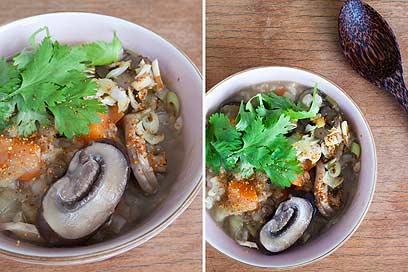 הסיפור מתחיל בבישול ארוך של מעט אורז עד לפירוקו לכדי דייסה סמיכה אותה מעשירים בתבלינים ותוספות כמו ג'ינג'ר, רוטב דגים, פטריות, אפונה, בצל מטוגן, עוף או קוביות בייקון, הכל תלוי בזמן, במקום, בחשק ובמה שיש בבית.