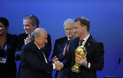 בלאטר מעניק לנציג הרוסי את גביע העולם. עלה לו בכסף (AFP)