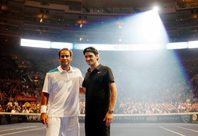 סמפראס עם רוג'ר פדרר. כעת אין ויכוח למי יש יותר גביעים (AFP)