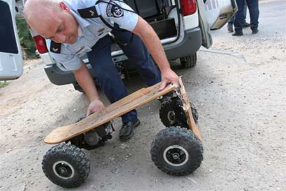 שוטר בוחן את הסקייטבורד עליו נסע אמיר בלחסן (צילום: אבי מועלם)