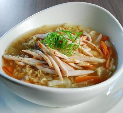 ציר עוף אסיתי, חזה עוף צלוי, אטריות ראמן, גזר, כרוב, ובצל ירוק. באדיבות מסעדת ריבר
